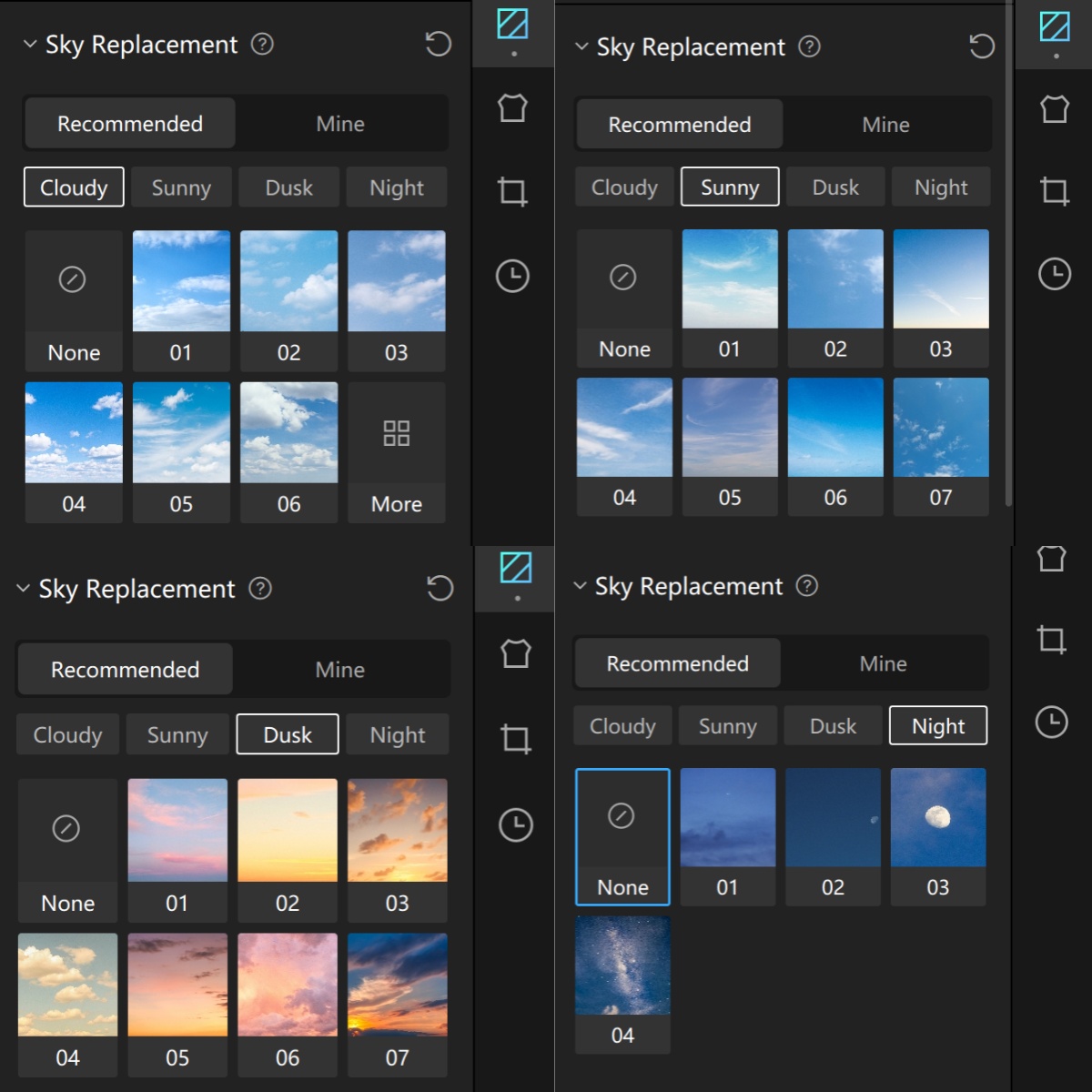 - Browse through the built-in library of high-resolution skies. You will find categories of cloudy, sunny, dusk, or night. Moreover, you can even upload and import the sky from your other images to apply to the photo you are retouching.