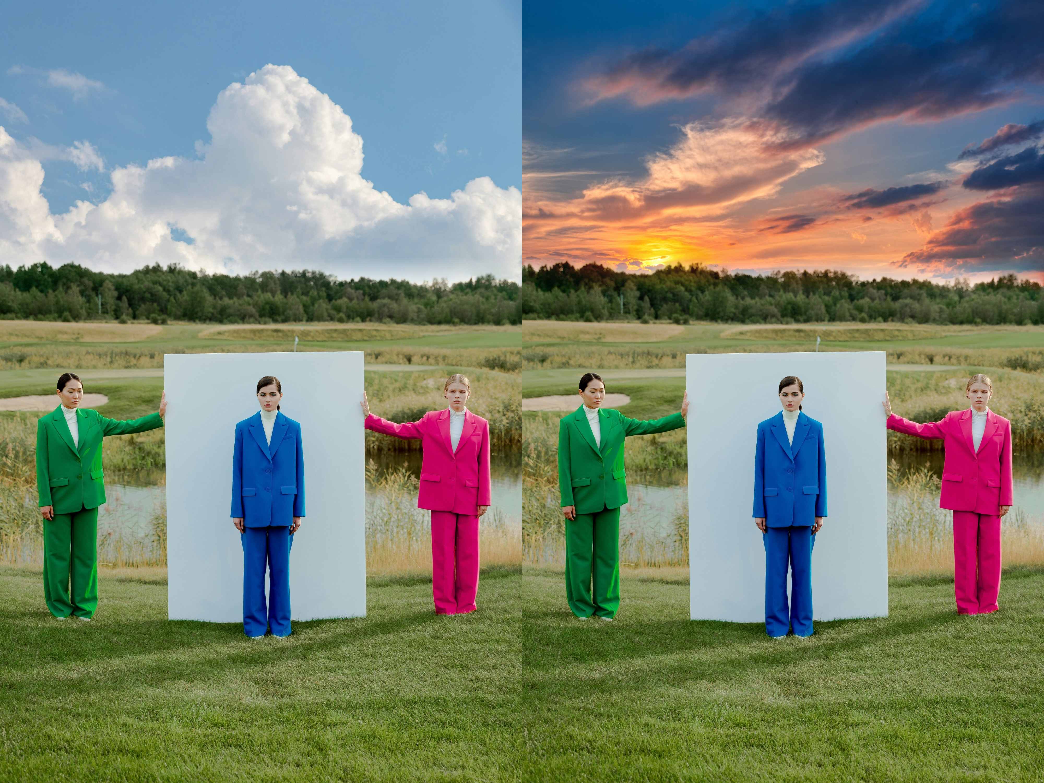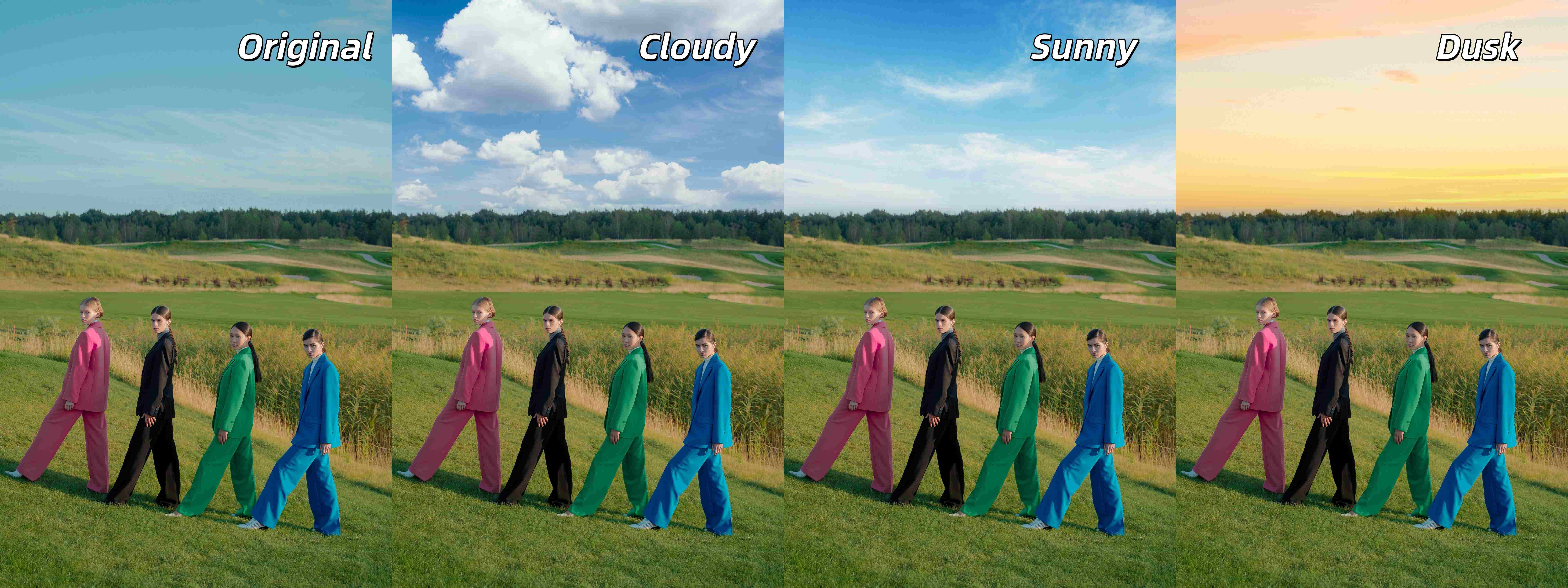 - Advanced Relighting: The AI doesn't just paste a new sky; it analyzes the light direction in your new sky and realistically re-lights the entire scene, casting new reflections and hues onto your foreground.