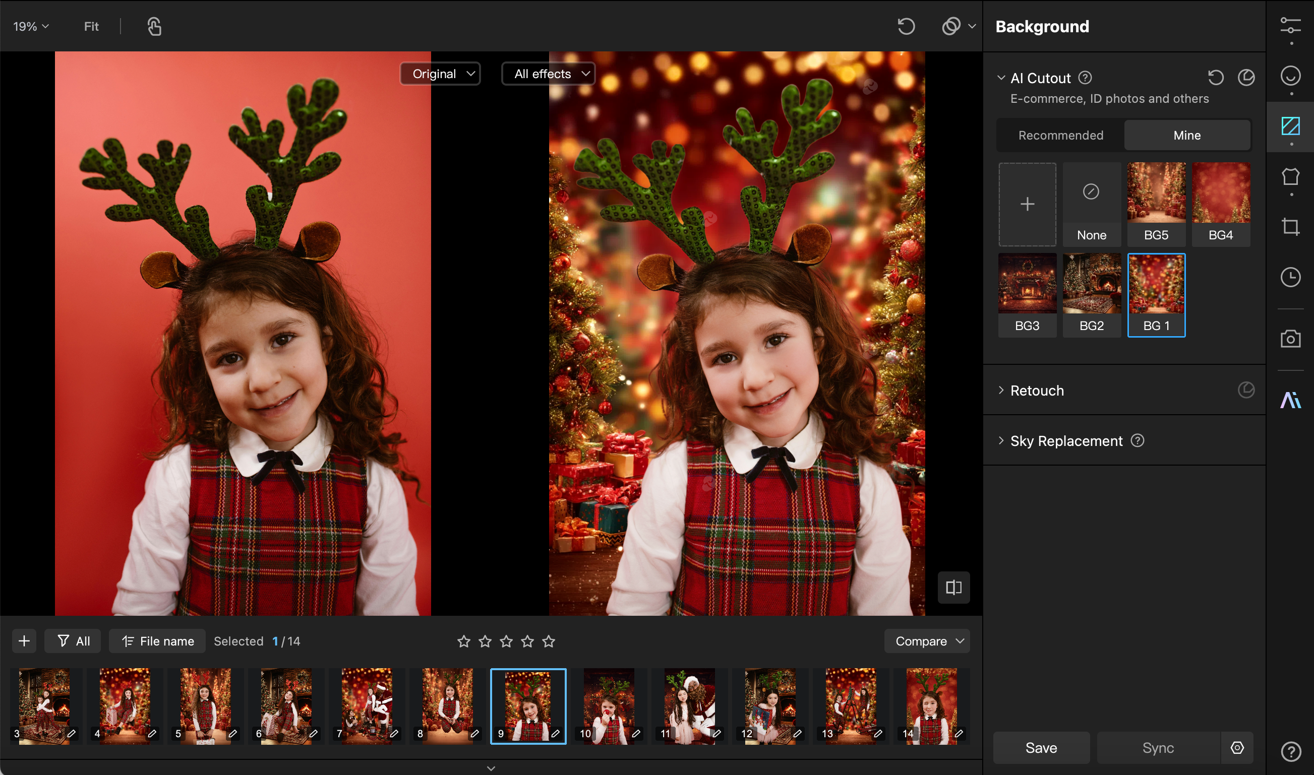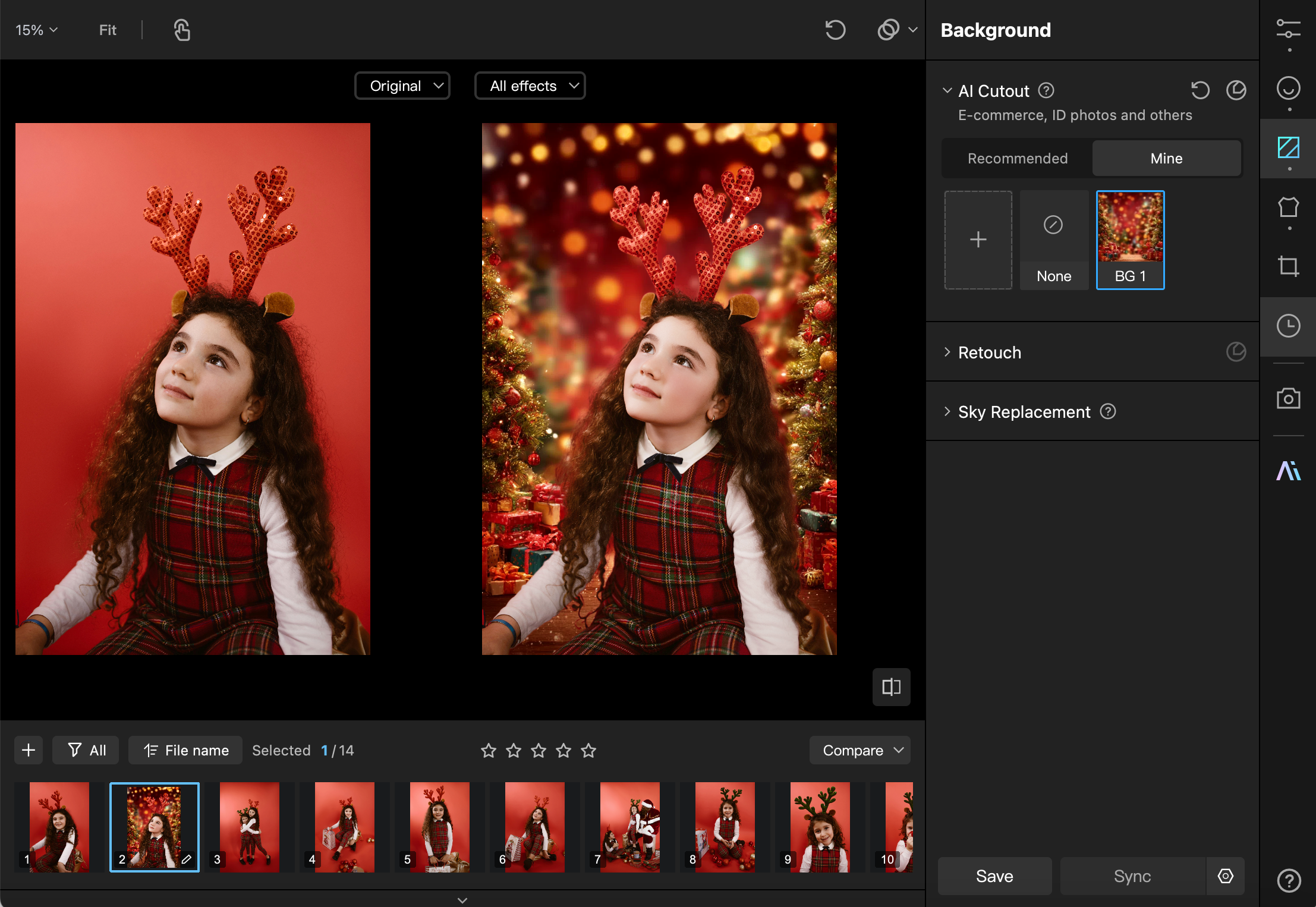 If your studio setup was limited, you can use Kumoo’s AI Cutout feature. It allows for one-click precision masking to replace a plain background with a festive scene. The AI ensures clean edges and natural lighting integration, which is a highly practical way to increase the commercial value of your work while keeping costs low.