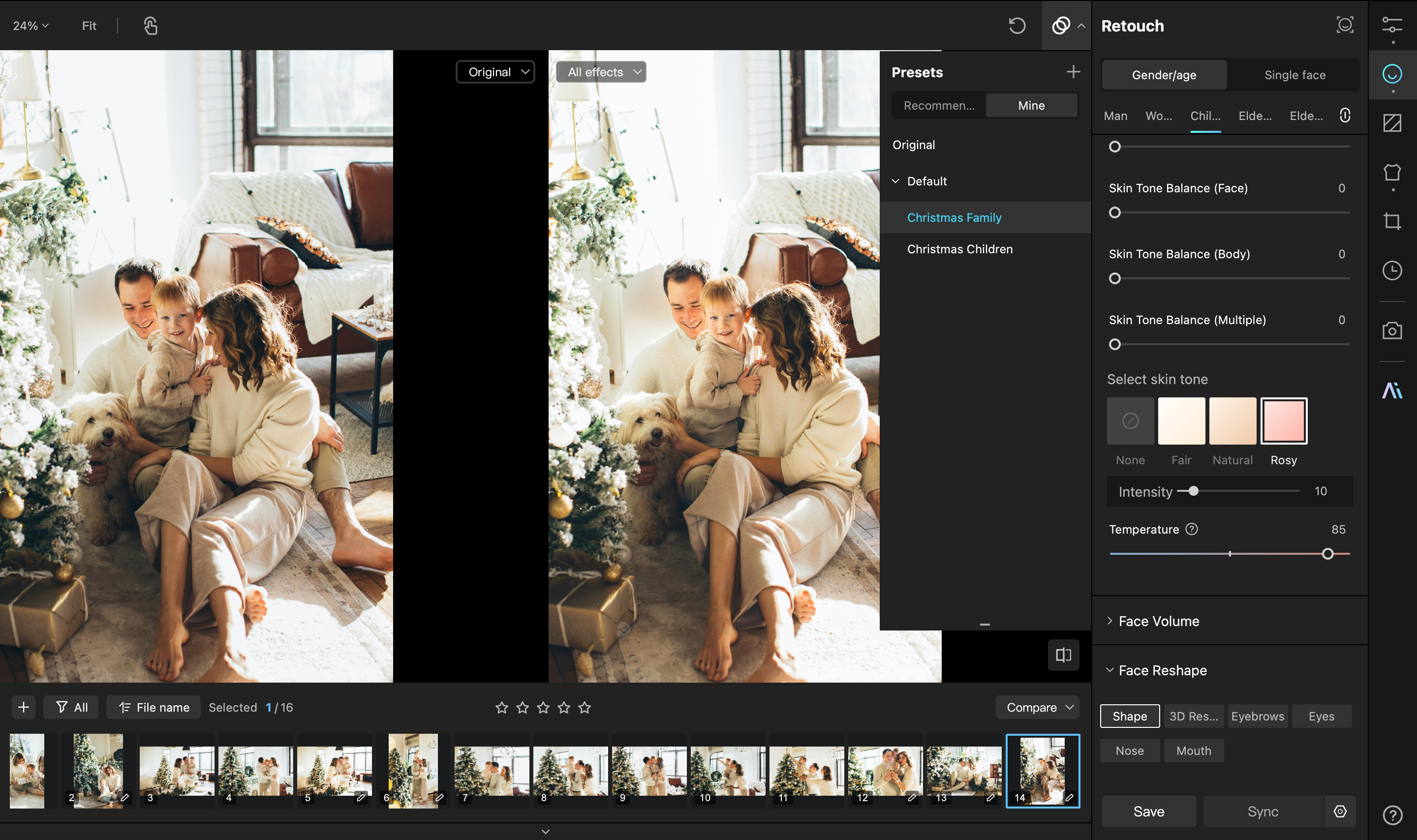 Using features like Remove Blemishes, Face Reshape, and Makeup, I can refine a subject's appearance without sacrificing the natural skin texture, perfect for families with high expectations.