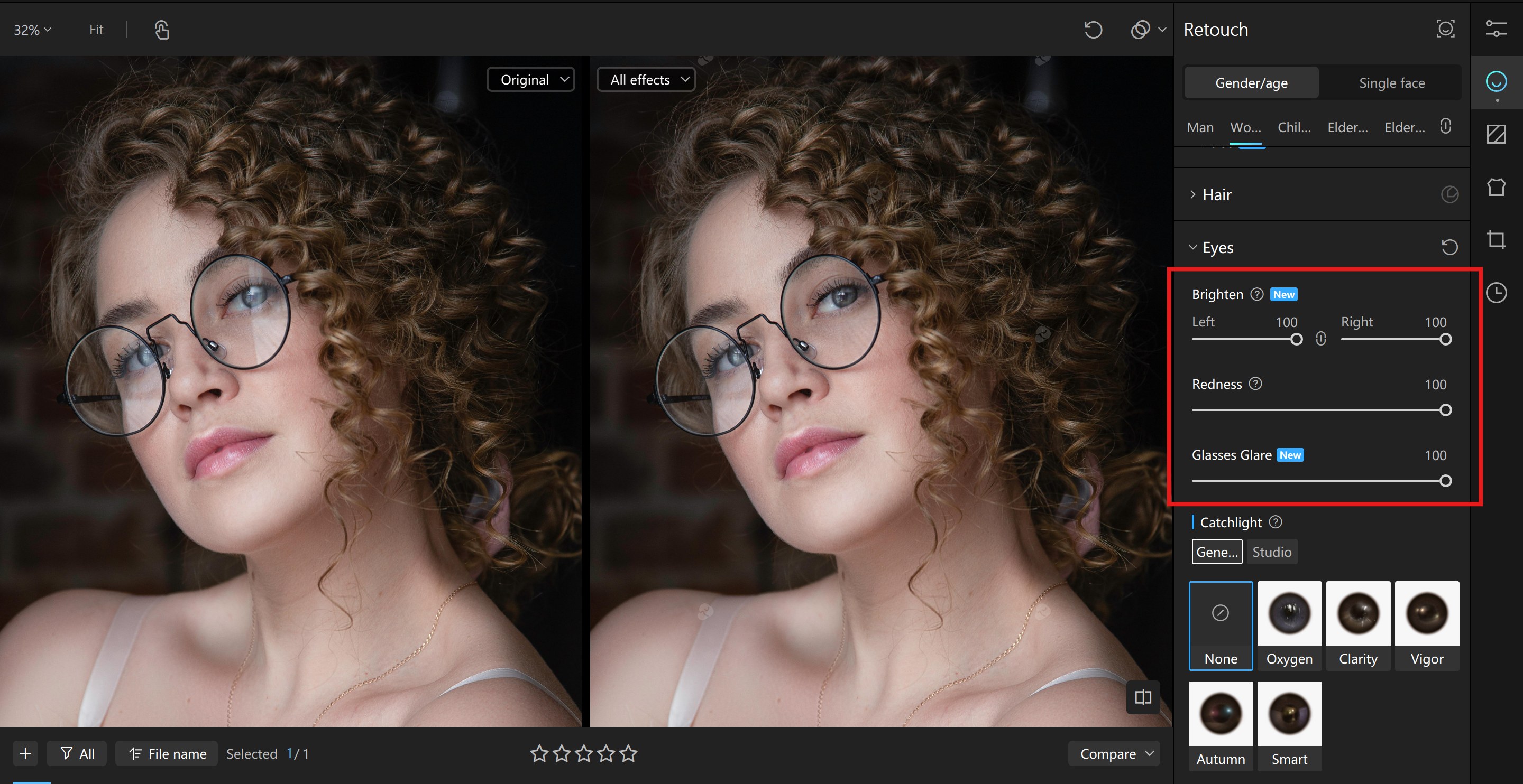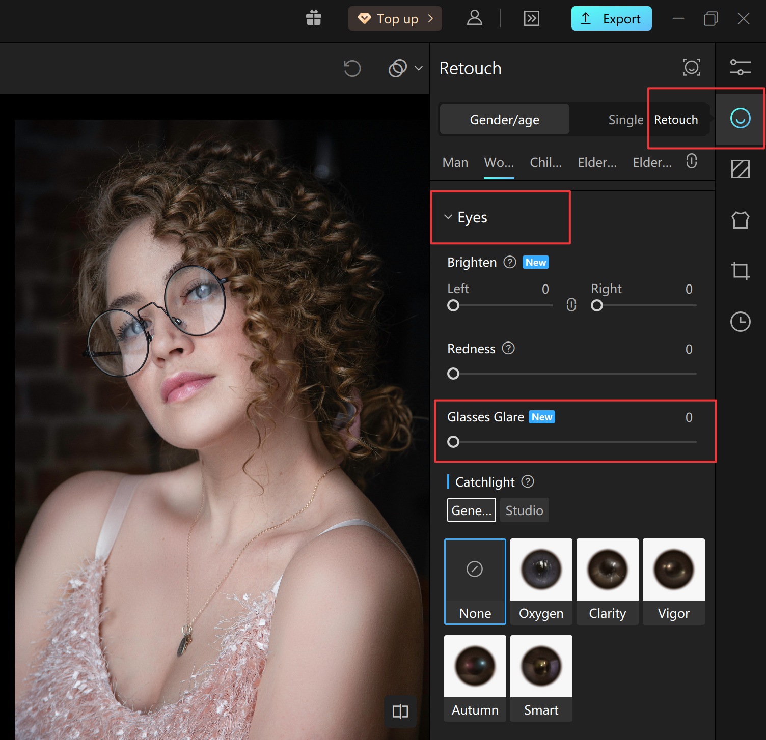 Step 2. Navigate to the "Retouch" panel located on the right sidebar. Within this module, select the "Eyes" category, where you will find the "Glasses Glare" adjustment bar.
