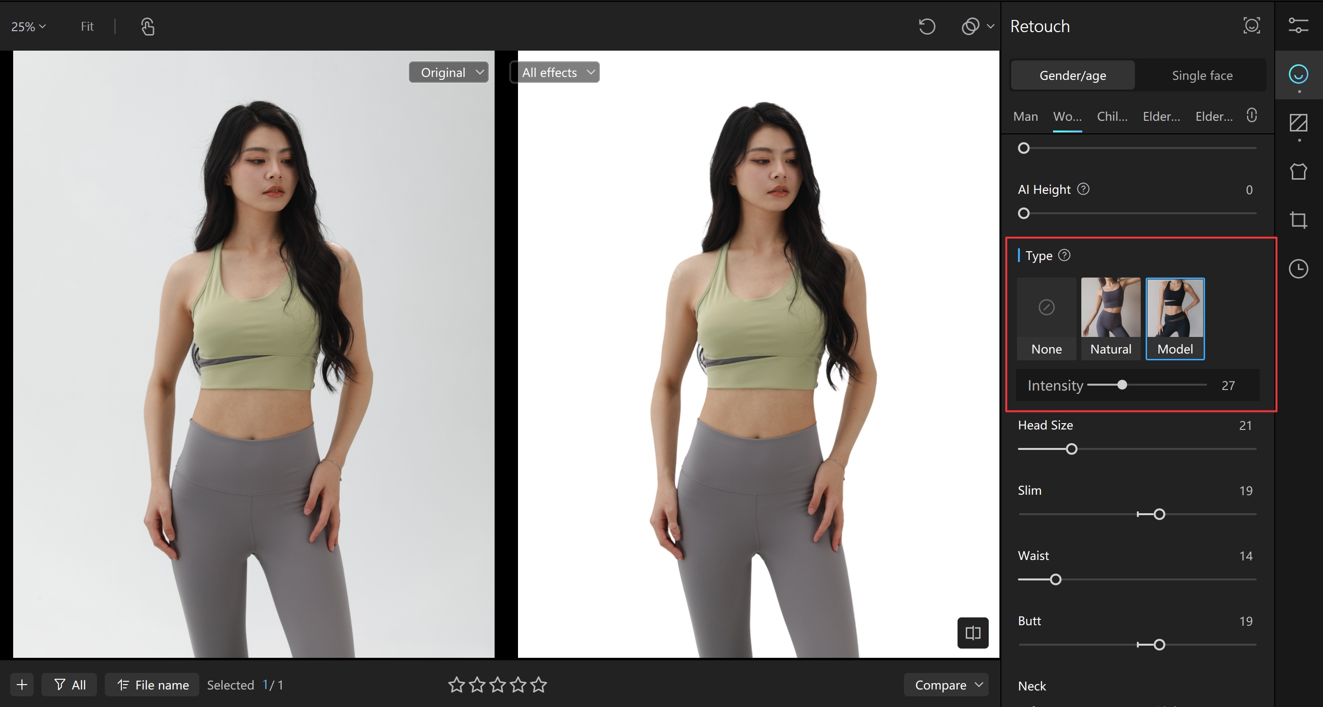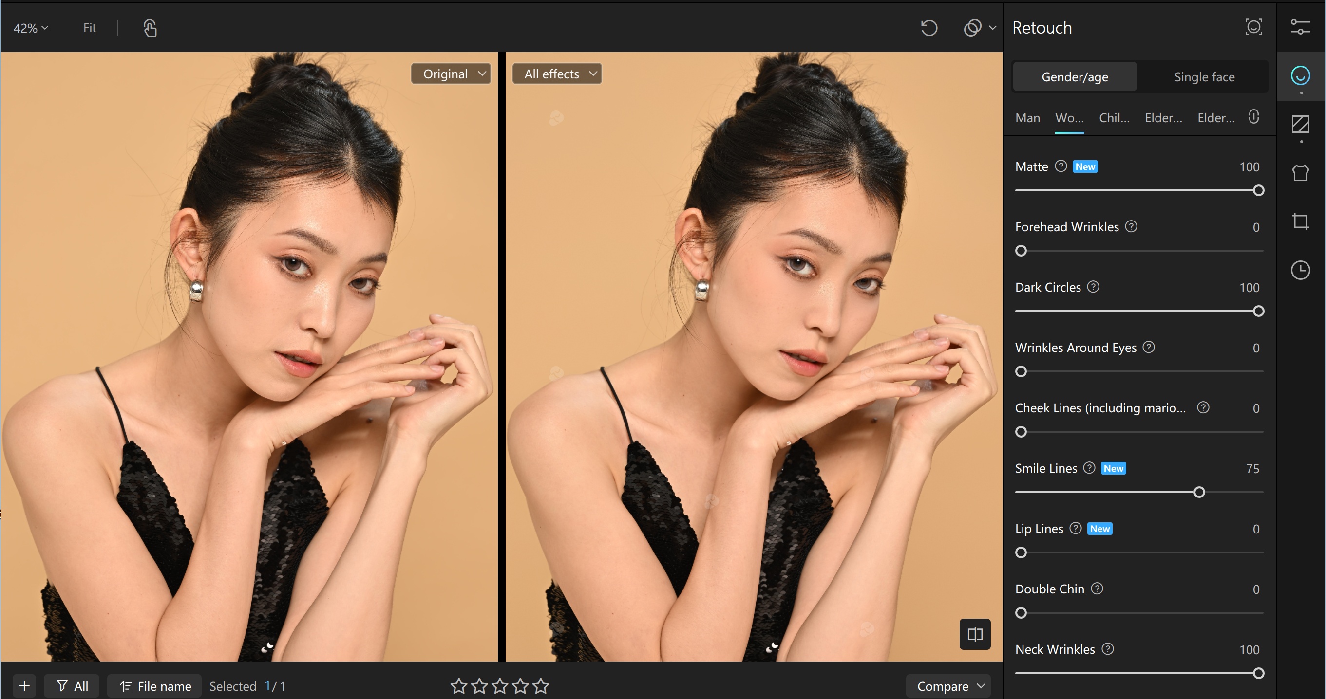 Portrait retouching plays a crucial role in product presentation, as the model's appearance directly affects visual appeal. Kumoo's innovative Makeup Protection feature intelligently removes skin blemishes while preserving original makeup details, ensuring flawless yet natural-looking edits. Additionally, Kumoo offers precise localized adjustments, covering facial feature enhancement, skin refinement, and makeup details, helping e-commerce retouchers achieve realistic, engaging imagery that boosts conversions.