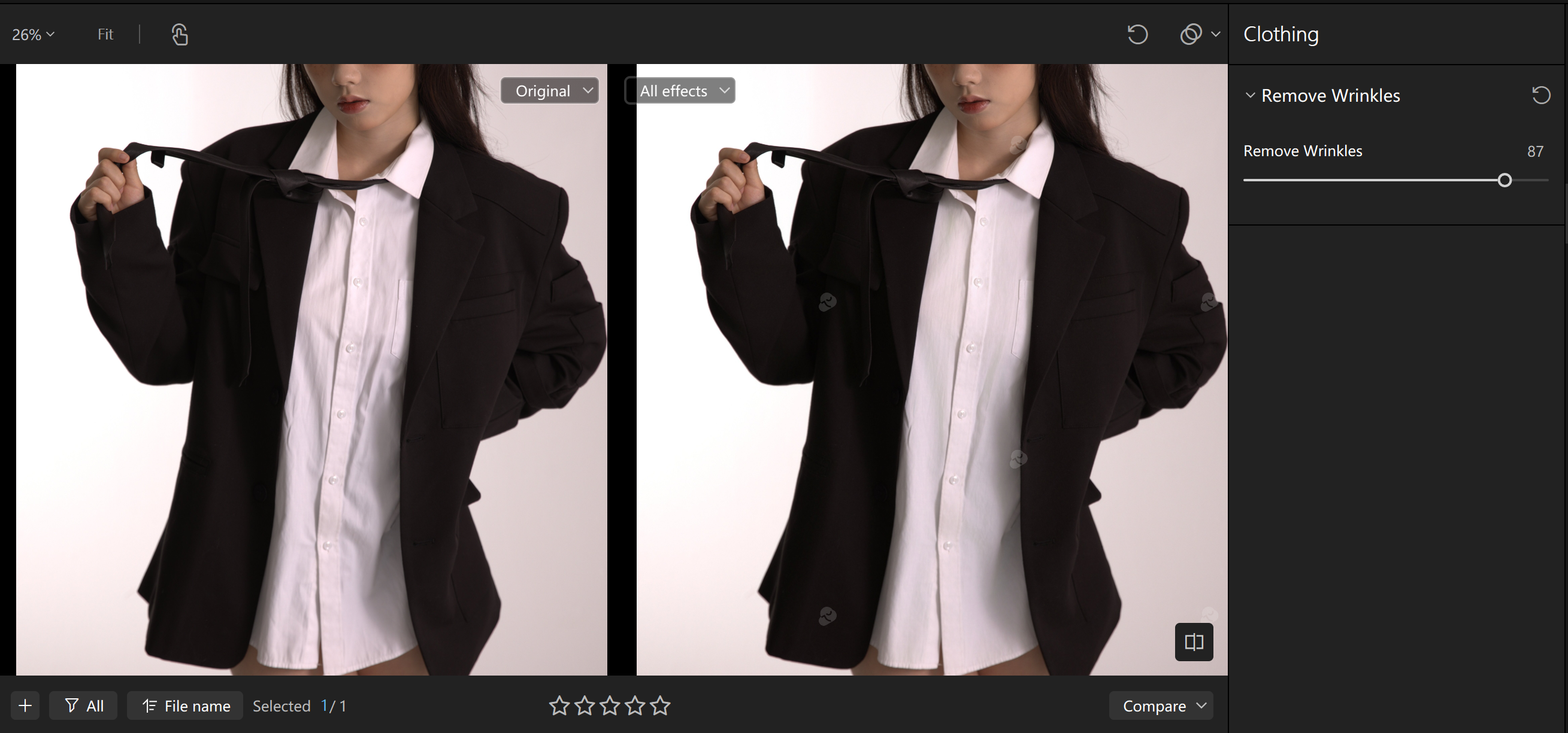 Kumoo's AI-powered Clothing Wrinkle Removal tool is the ultimate. Head over to "Clothing", slide the slider, and pick the intensity you prefer. Let AI automatically detect the clothing contour to smooth out wrinkles while preserving natural fabric texture. Within seconds, your clothing looks freshly pressed, with zero distortion of original lighting or shadow. Whether it's model shots or flat-lay images, Kumoo delivers flawless results every time.