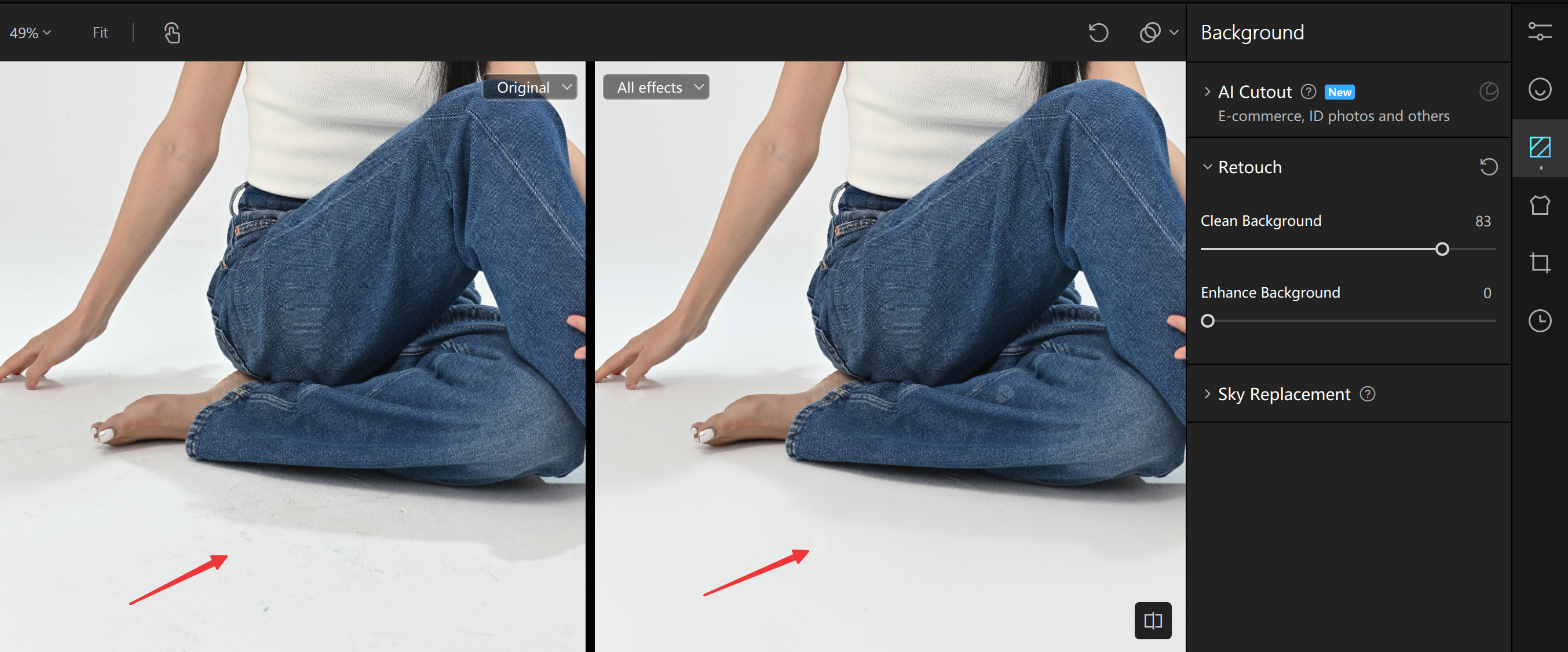 In studio photography, the most common issues are imperfections, such as unwanted marks in backgrounds, flooring, or wallpaper, many of which are even magnified by the camera. With Kumoo's background retouching feature, simply adjust the slider from the "Clean Background" section to your desired intensity, and all background flaws will be removed in seconds with precision.